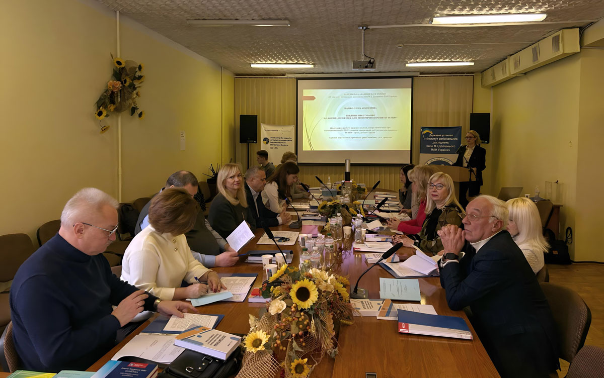 | 05.12.2025, ДУ “Інститут регіональних досліджень ім. М. І. Долішнього НАН України”. В Інституті регіональних досліджень відбувся успішний захист докторської дисертації 5 грудня 2025 року в ДУ “Інститут регіональних досліджень імені М. І. Долішнього НАН України” відбувся захист дисертаційної роботи Івашко Олени Анатоліївни на тему: «Публічне інвестування збалансованого соціально-економічного розвитку регіону» на здобуття наукового ступеня доктора економічних наук за спеціальностями 08.00.05 – розвиток продуктивних сил і регіональна економіка та 08.00.08 – гроші, фінанси і кредит. Дисертаційна робота присвячена комплексному науковому обґрунтуванню підходів до формування ефективної моделі публічного інвестування регіонального розвитку у сучасних умовах трансформації економіки, обмеженості фінансових ресурсів та зростання регіональних викликів у період війни та відновлення. У дослідженні сформовано авторське бачення стратегічної ролі державних інвестицій у посиленні економічної стійкості регіонів, розвитку людського капіталу, модернізації інфраструктури та забезпеченні рівних можливостей соціально-економічного зростання. Головуючим на засіданні був заступник голови спеціалізованої вченої ради, директор ДУ "Інститут регіональних досліджень імені М. І. Долішнього НАН України", доктор економічних наук, професор Тарас Васильців. Науковим консультантом здобувачки є д.е.н., професорка Сторонянська Ірина Зеновіївна. Офіційними опонентами виступили: д.е.н., професорка Заблодська Інна Володимирівна, д.е.н., професорка Забарна Елеонора Миколаївна, д.е.н., професорка Кириленко Ольга Павлівна. Інститут щиро вітає Олену Анатоліївну з успішним захистом та здобуттям наукового ступеня доктора економічних наук, бажає подальших наукових здобутків, професійного визнання та плідної праці в ім’я розвитку регіональної економіки України! Фото з події: