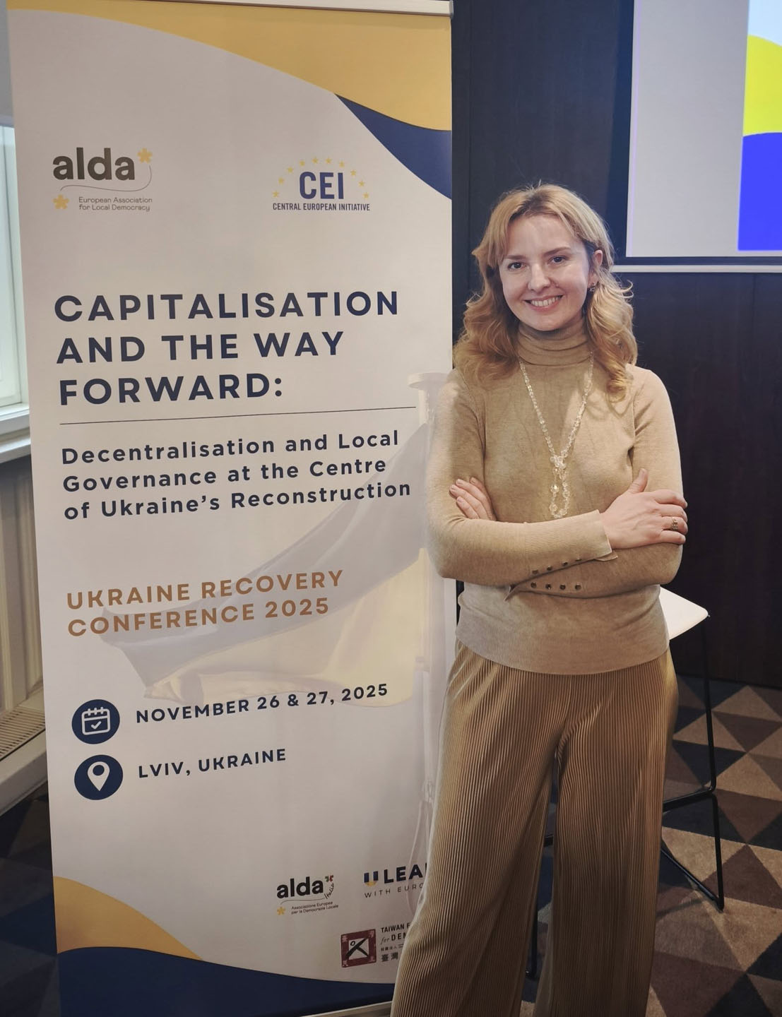 | 27.11.2025, Львів. Міжнародна конференція «Ukraine Recovery Conference 2025. Capitalisation and the Way Forward: Decentralisation and Local Governance at the Centre of Ukraine’s Reconstruction» 27 листопада 2025 року старший науковий співробітник відділу просторового розвитку, к.е.н., ст.д. Соломія ТКАЧ на запрошення урбаністичної коаліції Ro3kvit: Urban Coalition for Ukraine, відвідала міжнародну конференцію «Ukraine Recovery Conference 2025. Capitalisation and the Way Forward: Decentralisation and Local Governance at the Centre of Ukraine’s Reconstruction». Захід організований ALDA - European Association for Local Democracy та Центральноєвропейською ініціативою (CEI) за підтримки U-LEAD з Європою та Тайваньського фонду за демократію й відбувався 26–27 листопада у Львові. У ньому взяло участь понад 20 спікерів та понад 100 учасників з України та Європи. На конференції обговорювали регіональний розвиток крізь призму повоєнної відбудови, глобальних партнерств і міжнародних механізмів підтримки. Фактично фокус був на питаннях як світ долучається до відновлення регіонів України і які інструменти забезпечують перехід від амбіцій URC 2025 до підготовки URC 2026. Програма другого дня включала панельні дискусії про шлях «від зобов’язань до виконання» та визначення стратегічних кроків локального відновлення; вивчення інноваційних моделей управління для стійких міст; робочі групи з транскордонного співробітництва (Interreg), зеленого відновлення та діалогів громад за сприяння ALDA та міжнародних партнерів; а також воркшоп World Café з напрацювання пропозицій для наступної Конференції з відновлення України. Результати конференції переконливо показали: місцеве самоврядування, громадянське суспільство та міжнародні партнери формують потужну триєдину опору відбудови. Саме ця співпраця визначає, якими будуть стійкі громади завтра і що саме Україні вдасться реалізувати до URC 2026. Програма конференції тут. Більше про подію за посиланням Фото з події: