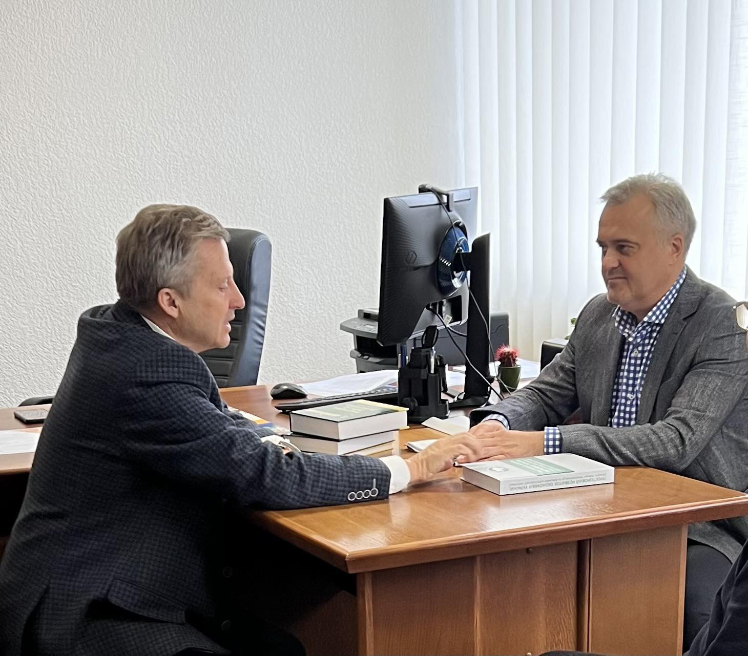 | 01.10.2025, Львів. Робоча зустріч директора Державної установи «Інститут регіональних досліджень імені М. І. Долішнього НАН України» з ректором Київського університету права НАН України 1 жовтня 2025 року у Державній установі «Інститут регіональних досліджень імені М. І. Долішнього НАН України» відбулася робоча зустріч директора Інституту Тараса ВАСИЛЬЦІВА з ректором Київського університету права НАН України Юрієм БОШИЦЬКИМ. Ця зустріч стала не лише підтвердженням, а й логічним кроком у продовженні багаторічної співпраці між Інститутом та Київським університетом права НАН України. Особливістю Київського університету права НАН України є тісний зв'язок освітнього процесу з академічною наукою. Університет спеціалізується на підготовці висококваліфікованих юристів, які можуть працювати у державних, правоохоронних органах, сфері ринкової економіки та науковій сфері. Керівники установ окреслили пріоритети співробітництва у сфері освітніх, наукових та інформаційних проєктів, зокрема спрямованих на організацію спільних комунікативних заходів, активне залучення науковців Інституту до підготовки та видання спільних монографічних праць. На завершення зустрічі відбувся обмін науковими виданнями для поповнення бібліотечних фондів обох академічних закладів. Фото з події: